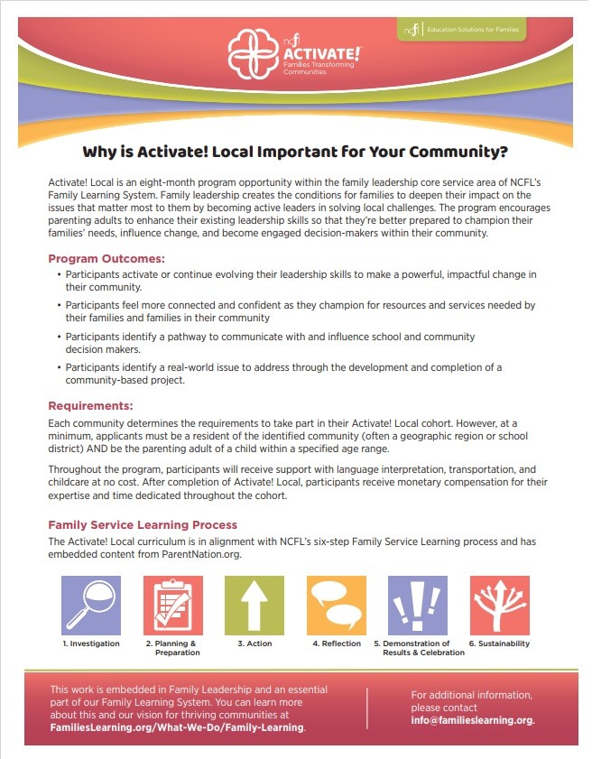 Activate! Local is a project-based leadership model in which parenting adults identify and address critical issues in their school or community. With training and ongoing support provided by NCFL, local facilitators lead cohort participants through an 8-month program that helps to evolve their leadership skills and identify pathways to communicate with and influence local decision-makers.