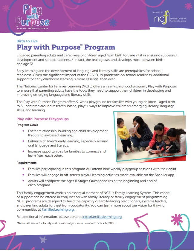 NCFL’s Play with Purpose is a 9-week, facilitated playgroup for families with young children–ages birth through five–centered around research-based, playful ways to support children’s emerging literacy, language skills, and learning.
